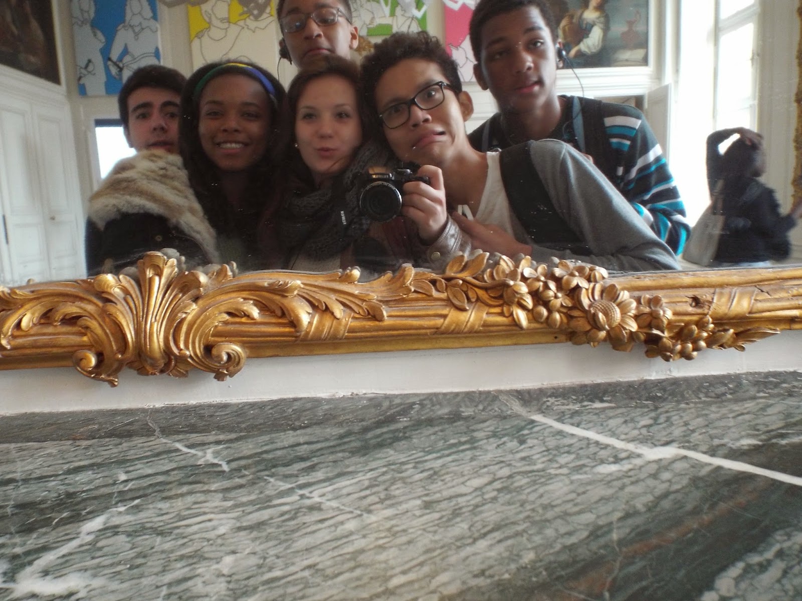Je suis dans la galerie des glaces. La Grande Galerie servait de lieu de passage, d'attente et de rencontres, fréquenté par les courtisans et le public des visiteurs. Après je vois Le salon de l'Abondance. C'est le lieu des rafraîchissements. C'était aussi l'antichambre du cabinet des curiosités ou des raretés de Louis XIV. Maintenant je vois le salon de l'oeil-de-Boeuf où les courtisans attendaient dans le salon de l'oeil-de-Boeuf, avant d'être introduits dans la chambre royale dont un garde-suisse gardait l'entrée. Après je suis entré dans La Chapelle royale ... elle est vraiment très jolie. Chaque jour, le matin à 10 heures, la Cour assistait à la messe du roi. Les dames de la Cour occupaient les tribunes latérales.